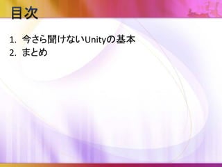 目的 Unityのオンラインマニュアルから意外と知られて いないと思われる便利な機能を一つでも多く覚 えて頂いて持ち帰ってもらう事 全部知っていたら、Unityの勉強を始めた人にこの 資料を紹介して頂く事 最終的にはこんな資料が不要に なるぐらい公式ドキュメントが整 備されること!