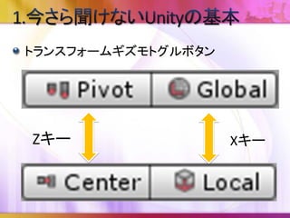 入門/Unity のショートカットキー http://docs.unity3d.com/ja/current/Manual/UnityHotkey s.html Mac/Windows別にPDFファイルも用意されてい ます。 ここでは一部だけご紹介します。 勿論、Ctrl+Pも紹介します!