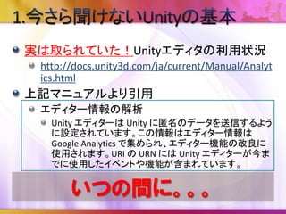実は取られていた!Unityエディタの利用状況 http://docs.unity3d.com/ja/current/Manual/Analyt ics.html 上記マニュアルより引用 エディター情報の解析 Unity エディターは Unity