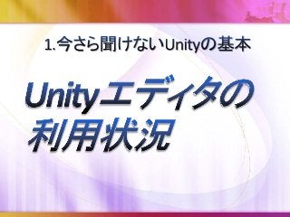 背景 ここ2~3年でUnity関連書籍が大変増えた 某密林サイトで「unity 本」を検索すると1,761件 Unityの基本機能は比較的シンプルな構成である ことと、比較的とっつきやすい操作体系のため、ど んどんとユーザが増えている(印象) 2015/12/01時点の検索結果
