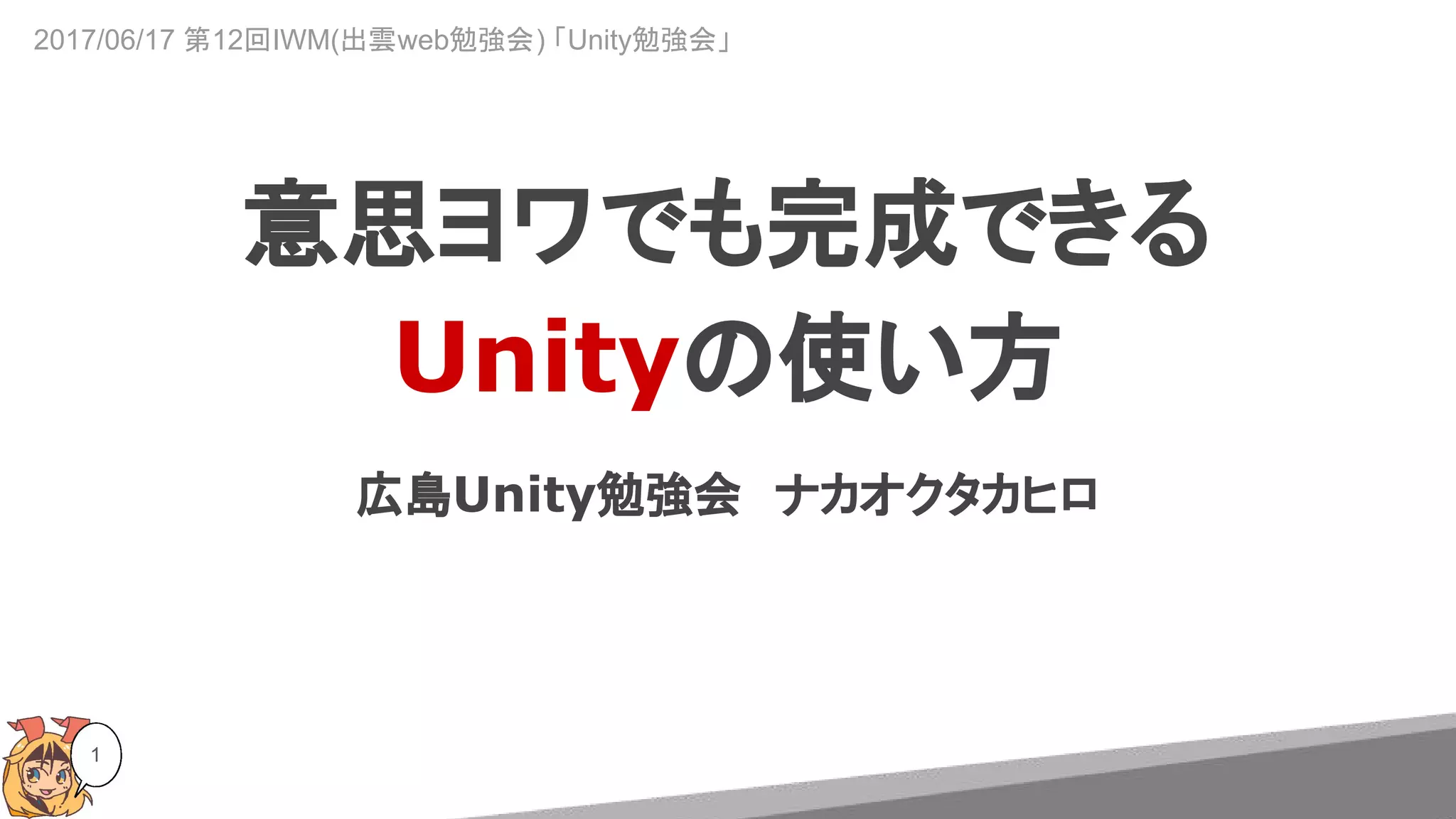 2017年6月17日に開催された『第12回IWM(出雲web勉強会)「Unity勉強会」』で発表した資料です。 詳細 : https://iic.connpass.com/event/58296/ 広島Unity勉強会 : https://hiroshima-unity.jimdo.com