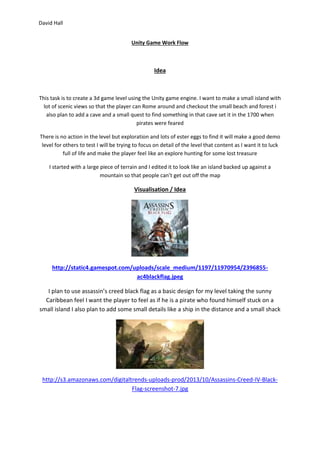 This document outlines David Hall's process for creating a 3D game level set on a small island using the Unity game engine. The level aims to allow players to explore scenic views and a forest while hunting for treasure. David took inspiration from Assassin's Creed Black Flag, seeking to recreate the Caribbean feel. He added details like a shipwreck and smuggler's cave filled with supplies. Through blocking, texturing, sound effects and lighting, David brought the island level to life for players to freely imagine stories within.