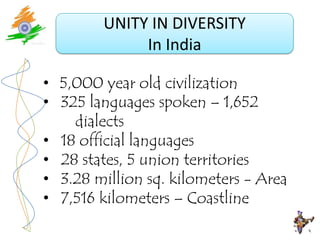 The document discusses India's diversity in terms of its long civilization, many languages and dialects, states and territories, geography, form of government, and status as the world's largest democracy. It notes India has a population of over 1 billion people speaking over 300 languages and following several major religions. Despite its diversity, India has maintained unity throughout its history.
