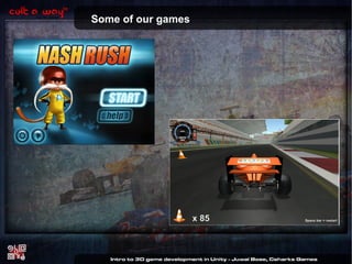 The document discusses tools for making 3D games and focuses on Unity as a game engine. It provides an overview of Unity's features such as its 3D visual editor, physics and lighting systems, scripting, and asset store. It also discusses approaches to programming in Unity using components and game objects as well as 3D art creation tools like Blender that can be used. The document aims to visually teach Unity and shows examples of games that can be built with it like a target shooting game or infinite runner.