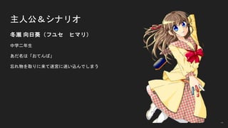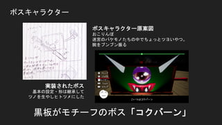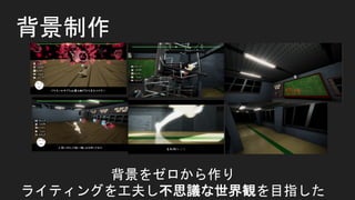 The document discusses UI/UX design and mentions Windows, XInput, Metasequoia, Xismo, Blender, AI, Unity, prefabs like Himari.Prefab, Kokubarn.Prefab and Keshigomu.Prefab, and the Unity interfaces IAction and ITimeControl. It also references the Unity Timeline feature.
