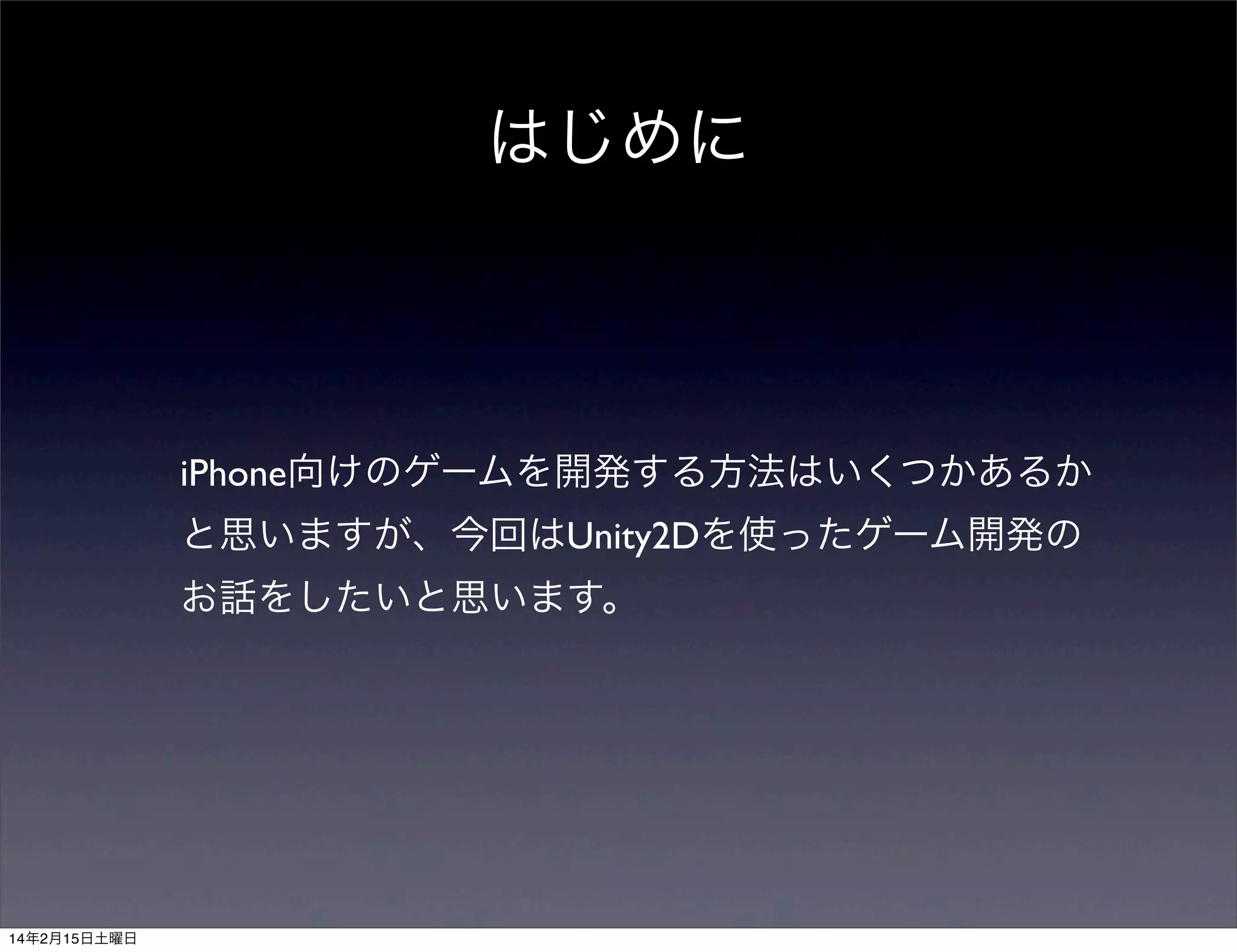 はじめに iPhone向けのゲームを開発する方法はいくつかあるか と思いますが、今回はUnity2Dを使ったゲーム開発の お話をしたいと思います。 14年2月15日土曜日
