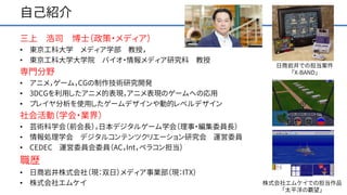 東京工科大学 メディア学部 教授, • 東京工科大学大学院 バイオ・情報メディア研究科 教授 専門分野 • アニメ,ゲーム,CGの制作技術研究開発 • 3DCGを利用したアニメ的表現,アニメ表現のゲームへの応用 • プレイヤ分析を使用したゲームデザインや動的レベルデザイン 社会活動(学会・業界) • 芸術科学会(前会長),日本デジタルゲーム学会(理事・編集委員長) • 情報処理学会 デジタルコンテンツクリエーション研究会 運営委員 • CEDEC 運営委員会委員(AC,Int,ペラコン担当) 職歴 • 日商岩井株式会社(現:双日)メディア事業部(現:ITX) • 株式会社エムケイ 2株式会社エムケイでの担当作品 「太平洋の覇望」 日商岩井での担当案件 「X-BAND」