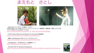MotionControl Network) Co-founder(共同創設者) https://www.facebook.com/TokyoMotioncontrolNetwork ・著書「Intel RealSense SDK センサープログラミング」 https://www.shoeisha.co.jp/book/detail/9784798139630 ・HoloMagicians – 日本初のホロレンズ開発者チーム http://holomagicians.azurewebsites.net/ ・Microsoft MVP for Windows Development https://mvp.microsoft.com/ja-jp/PublicProfile/5002154?fullName=Satoshi%20%20Maemoto まえもと さとし 2