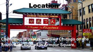 This document provides information about a visit to Chinatown in Chicago. It gives the location of Chinatown and directions via public transportation. It provides a brief history of how Chinatown was established. It includes demographic statistics and lists what the group experienced and did not get to see on their visit. It concludes with reflections from group members on their experience in Chinatown.