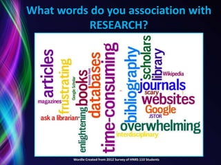 This document provides an overview of research resources available through George Mason University Libraries. It discusses common aspects of the research process across disciplines and highlights tools for finding and citing sources, such as the library catalog, journal databases, interlibrary loan services, and citation management software. The document encourages students to consult their subject liaison librarian or library workshops for help with research and citations.