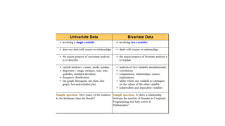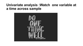 Univariate analysis examines one variable at a time across a sample. There are three main tools used in univariate analysis: distribution of frequency, measures of central tendency (mean, median, mode), and measures of dispersion. Distribution examines individual values, range, and charts. Central tendency measures the average or middle value. Dispersion measures the spread around the central tendency, such as the standard deviation and range. Common univariate analysis procedures include frequencies, descriptives, and explore in SPSS.
