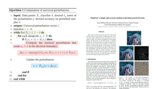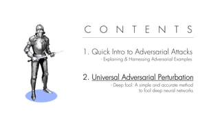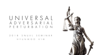 This document summarizes a seminar on universal adversarial perturbations. It begins with a quick introduction to adversarial attack methods like DeepFool. It then discusses the concept of universal adversarial perturbations - single perturbations that can fool neural networks into misclassifying most images. The document explains how universal perturbations are crafted to satisfy a fooling rate while being small. It shows that a single perturbation can achieve high fooling rates across different networks and models. It also discusses how universal perturbations capture the local geometry and correlations in the decision boundaries of neural networks.