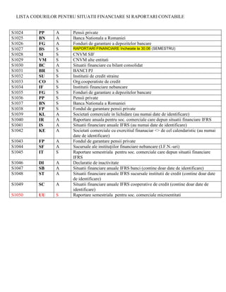 Documentul furnizează o listă detaliată de coduri pentru diferite situații financiare și raportări contabile utilizate de diverse entități economice, inclusiv societăți comerciale, organizații non-guvernamentale și instituții financiare. Aceste coduri sunt asociate cu formulare specifice, în funcție de exercitiul financiar ales de fiecare entitate, inclusiv opțiuni de contabilitate simplificată. Informațiile sunt esențiale pentru conformitatea cu reglementările contabile corecte.