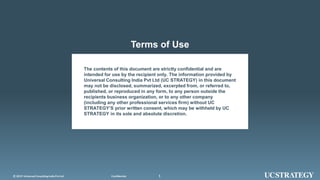 This document outlines the strategic implementation practices of Universal Consulting India Pvt Ltd and discusses the importance of a Program Management Office (PMO) approach to mitigate risks in strategy implementation. It emphasizes the significance of addressing common reasons for implementation failures, such as organizational misalignment and poor monitoring, and provides a framework for project prioritization and review cycles. The document also highlights the company's extensive experience in consulting and its focus on various industry sectors.