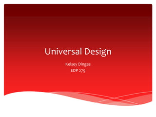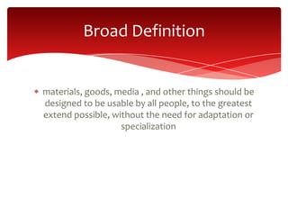 Universal Design aims to make products, communications, and environments usable by all people without the need for adaptation or specialized design. It has three main principles: providing multiple means of representation so that all people can understand information; multiple means of action and expression so people can navigate and express themselves in different ways; and multiple means of engagement to motivate people through varied options for participation. Universal Design for Learning specifically applies these principles to education to ensure all students can succeed as learners regardless of disabilities or other factors by reducing barriers in curriculum design.