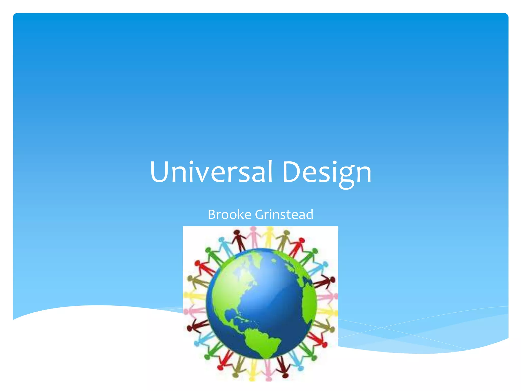 Universal design aims to create products and environments that can be used by all people without needing adaptation. It has seven principles including equitable use, flexibility, and low physical effort. An example of universal design in education is the ULTimate Reader, an electronic textbook that adds visuals or spoken voice to help students develop independence. While teachers see benefits, universal design is difficult to fully integrate into classrooms but developing technology skills and a flexible curriculum can help. Examples of universal design applications include auditory output, wide spaces, and intuitive controls.