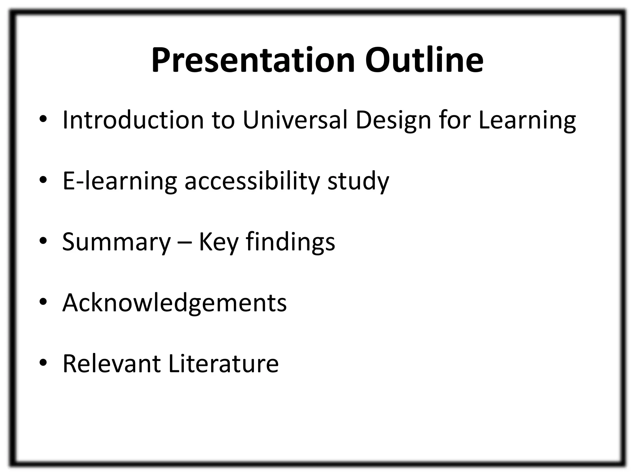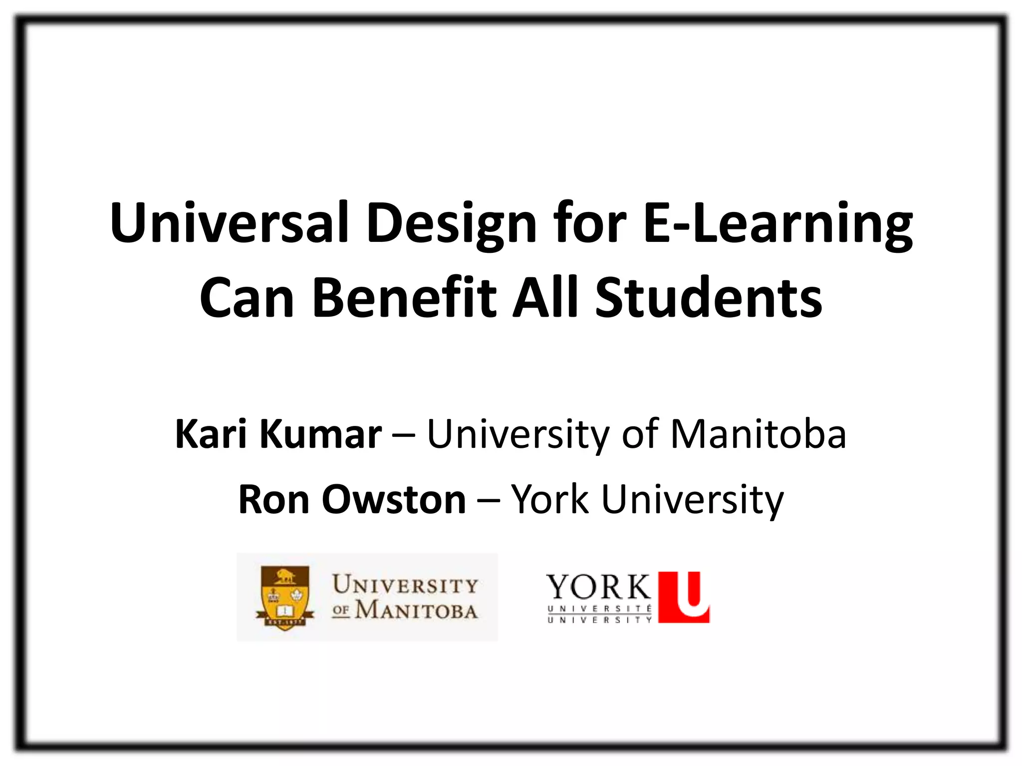 This document summarizes a study on the accessibility of e-learning environments. The study found that applying principles of Universal Design for Learning (UDL) can increase accessibility for all students. Specifically, the study found that an online course that provided multiple means of representation, action and expression, and engagement was equally accessible to students with and without learning disabilities. The study concluded that accessibility is highly individualized and relevant to diverse learners.