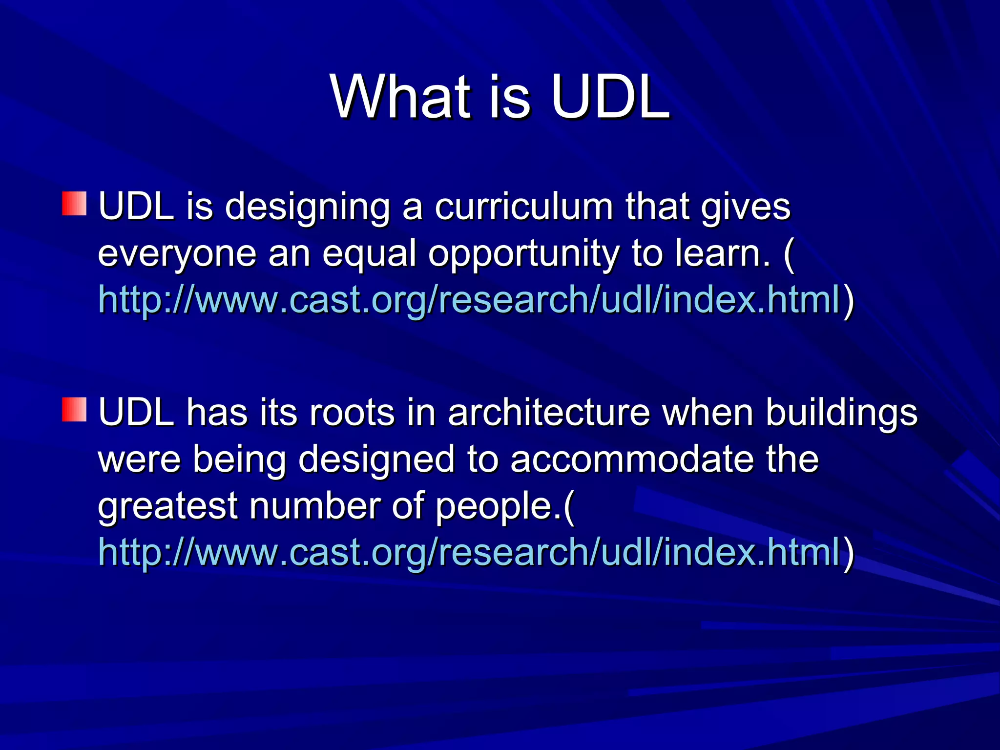 Universal Design for Learning (UDL) is a framework for designing curricula that provides multiple means of representation, action and expression, and engagement to give all students equal opportunities to learn. UDL has its roots in accessible architecture and has three principles - providing multiple means of representation through various formats like audio and video; multiple means of action and expression such as presentations and simulations; and multiple means of engagement like relating material to students' lives. Technology supports UDL by allowing various sources for implementing its principles to individualize learning and engage diverse students.