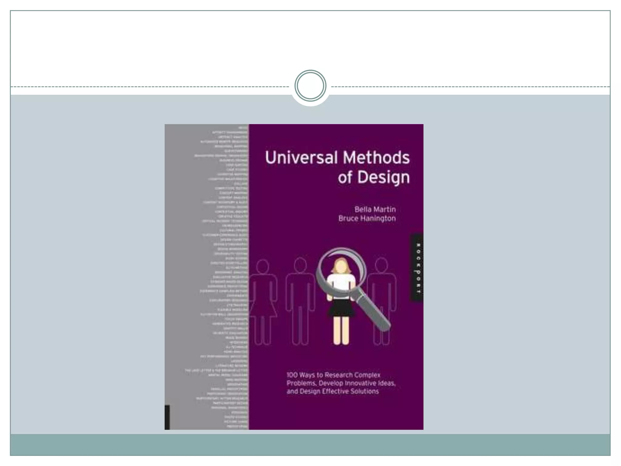 This document provides an overview of various universal principles and methods of design. It discusses key design principles such as affordance, closure, immersion, and Ockham's razor. It also outlines several user experience design methods including contextual inquiry, affinity diagramming, heuristic evaluation, think-aloud protocol, and usability testing. The document aims to explain these principles and methods to help teams make informed design decisions and evaluate designs effectively.
