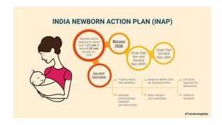 The document discusses the impact of Universal Health Coverage (UHC) on child growth and nutrition in India, highlighting the importance of addressing malnutrition and improving healthcare access to enhance child health outcomes. It outlines various government initiatives aimed at reducing maternal and infant mortality rates and achieving Sustainable Development Goals (SDGs) by 2030. Despite progress made, significant disparities in health indicators persist across different demographics and regions, underscoring the need for continued efforts in health reforms and interventions.