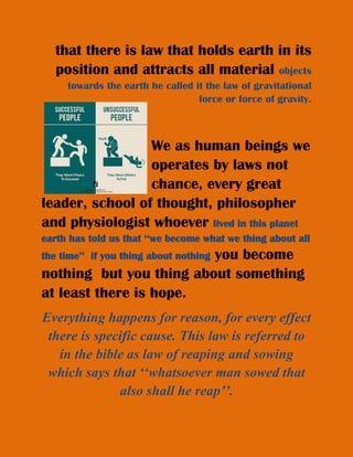 The document discusses the belief that God created the universe and the natural laws governing it, emphasizing the importance of human imagination and thought in shaping one's life. It explains that individuals can achieve success and prosperity by focusing on positive thoughts, which attract corresponding circumstances, while negative thoughts lead to negative outcomes. Additionally, it touches on the concept of the law of reaping and sowing, indicating that every effect has a specific cause and that the conditions of one's life can change by emitting new signals and focusing on desired results.