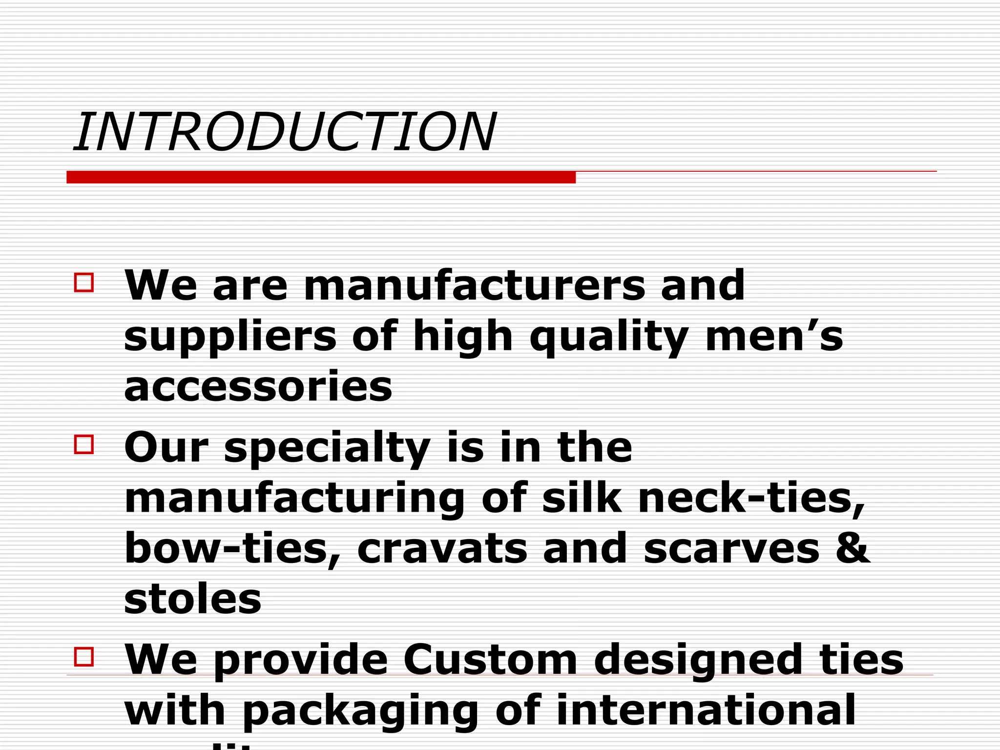 Universal Fashions manufactures and supplies high quality men's accessories such as silk neckties, bow ties, scarves, and stoles. They offer custom designed ties and have been in business for 15 years, manufacturing for top brands. Their product range includes formal silk neckties, printed silk ties, woven silk ties, brass cufflinks, pocket squares, and formal scarves made from fine materials like crepe in a wide range of colors and prints.