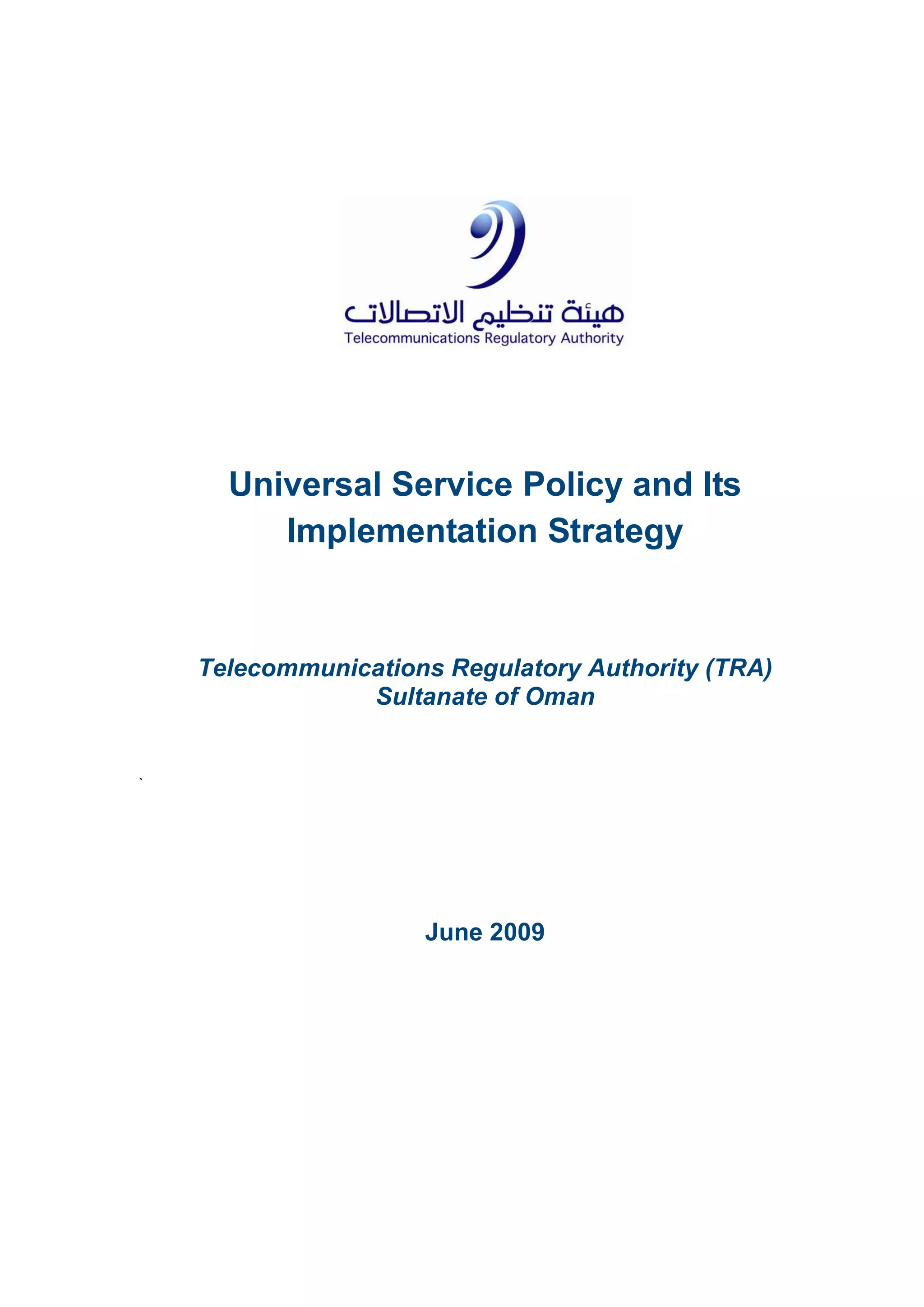 The document outlines the Sultanate of Oman's universal service policy and implementation strategy as established by the Telecommunications Regulatory Authority (TRA). It defines the scope of universal service to include basic telephony, internet access, broadband services, operator services, emergency services, public call boxes, telecenters, and maritime services. It describes criteria for selecting priority areas for universal service projects, including the presence of institutions, population levels, current lack of services, cost, and commercial viability. The document proposes tendering as the primary mechanism to implement universal service obligations, with a three-stage tender process. It also allows for using license conditions on existing operators and facilitating infrastructure sharing.