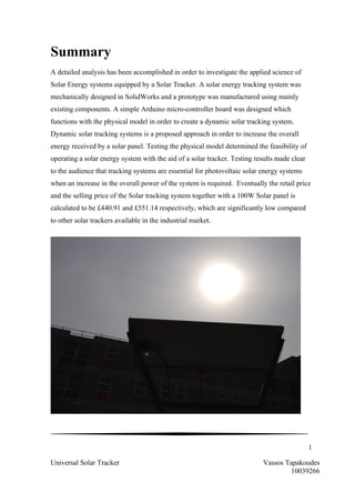 The document describes a student project to design and test a universal solar tracker. A prototype solar tracking system was designed in SolidWorks and built using existing components. An Arduino microcontroller board controls the system based on input from light dependent resistors. Testing found that the solar tracker increased power output over a fixed position system, demonstrating the benefits of tracking systems for improving photovoltaic solar energy efficiency. A cost analysis found the system would sell for £551.14, significantly lower than other trackers on the market.