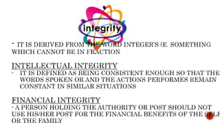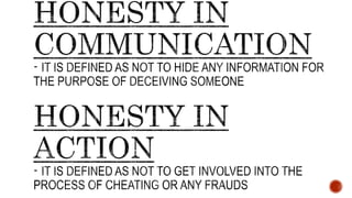 Values are beliefs that guide attitudes and actions. They help determine what is important and how to behave. Personal values reflect what one finds good or desirable, while cultural values are accepted by societies. Values are essential to ethics as they underlie choices and actions. Values can conflict between individuals as what one values may differ from another. Some values like honesty and kindness tend to be universally good.