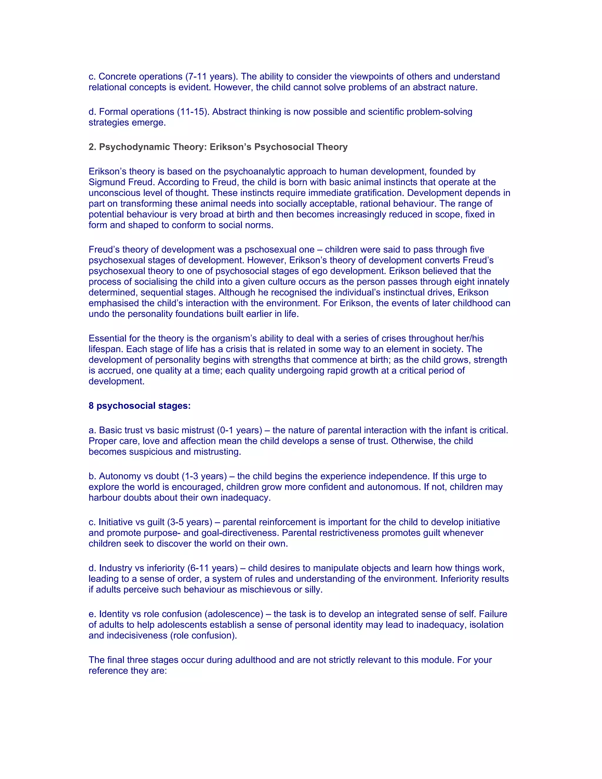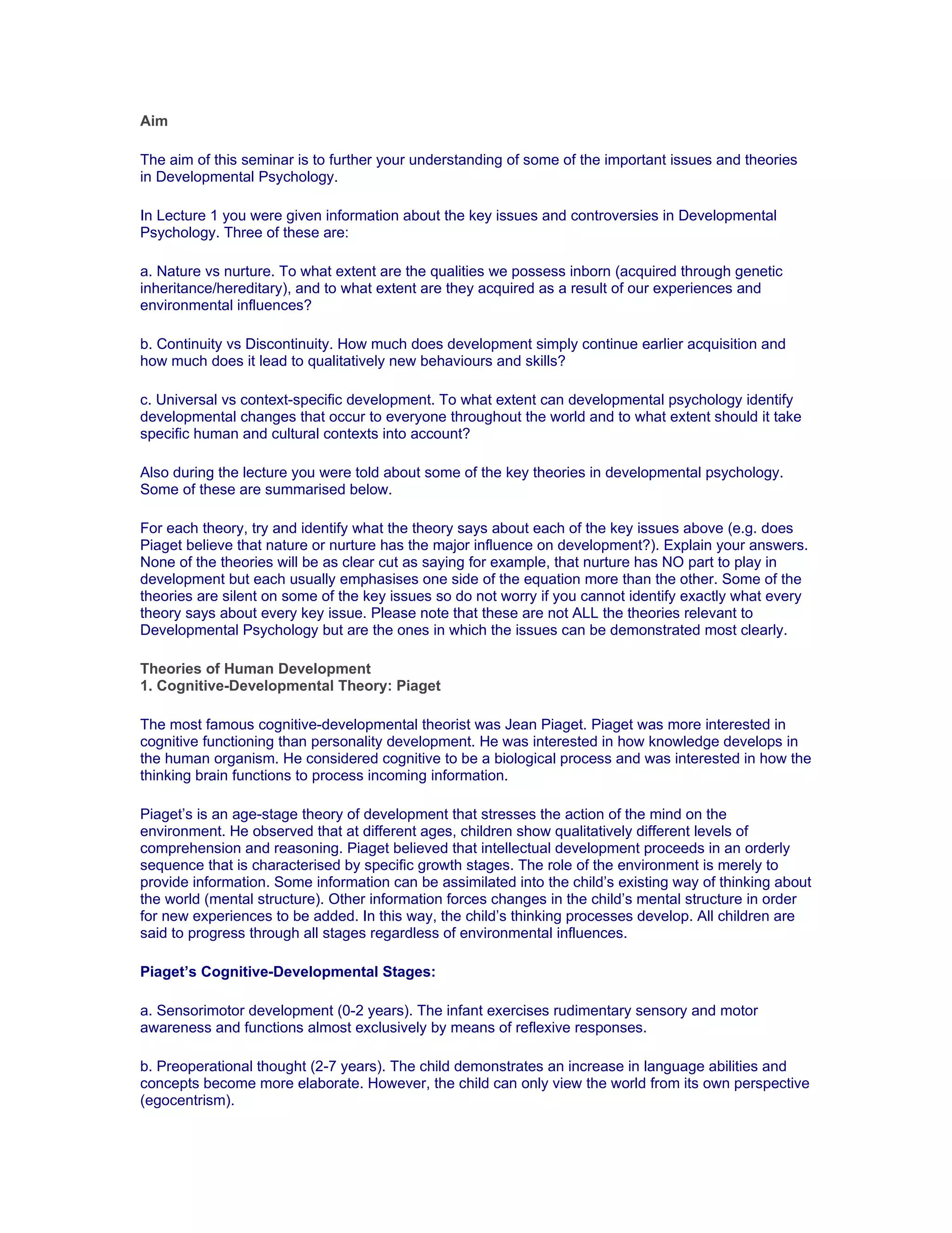 The document discusses three key issues in developmental psychology: nature vs nurture, continuity vs discontinuity, and universal vs context-specific development. It then summarizes three major theories: Piaget's cognitive-developmental theory which emphasizes innate stages of cognitive development influenced little by environment; Erikson's psychosocial theory which views development as proceeding through innate psychosocial stages with strong environmental influences; and social cognitive learning theory which sees development as the gradual accumulation of learned behaviors through modeling and reinforcement from the environment.