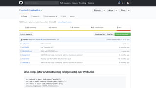 The document discusses the history and basics of USB technology. It provides details on USB connectors, transfer types (control, interrupt, isochronous), and descriptors used to communicate with USB devices. It then demonstrates how the WebUSB API can be used to create interactive demos connecting to Arduino boards, Android devices, smart home equipment, and building a public library system using RFID cards, a barcode scanner and receipt printer through the browser without additional drivers or software. WebUSB allows writing custom device drivers that work across browsers and operating systems for plug-and-play hardware interaction and developing interactive hardware prototypes more easily.