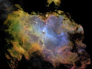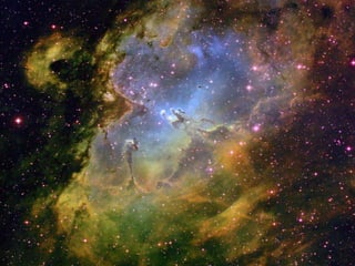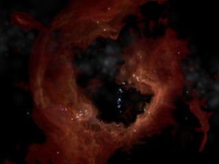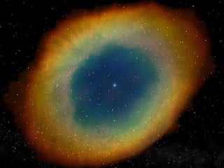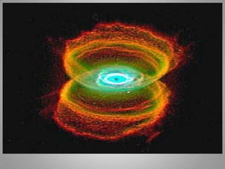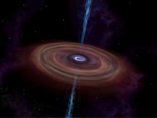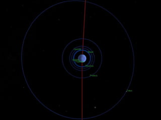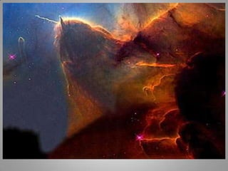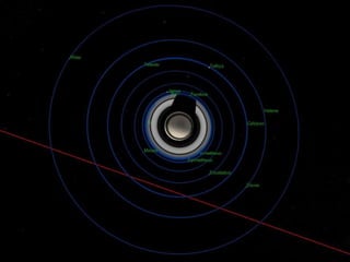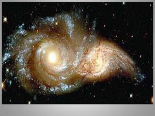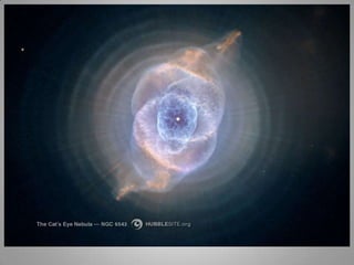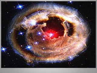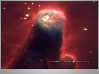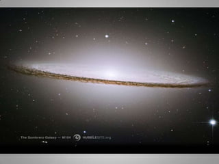 The document discusses various astronomical objects including the universe, Hubble space telescope, Voyager 1 spacecraft, UB 313 (Eris), Halley's Comet, a protostar, the sun, Milky Way galaxy, NGC 4414 galaxy, and credits LMG for the content and Blade Runner for the music.