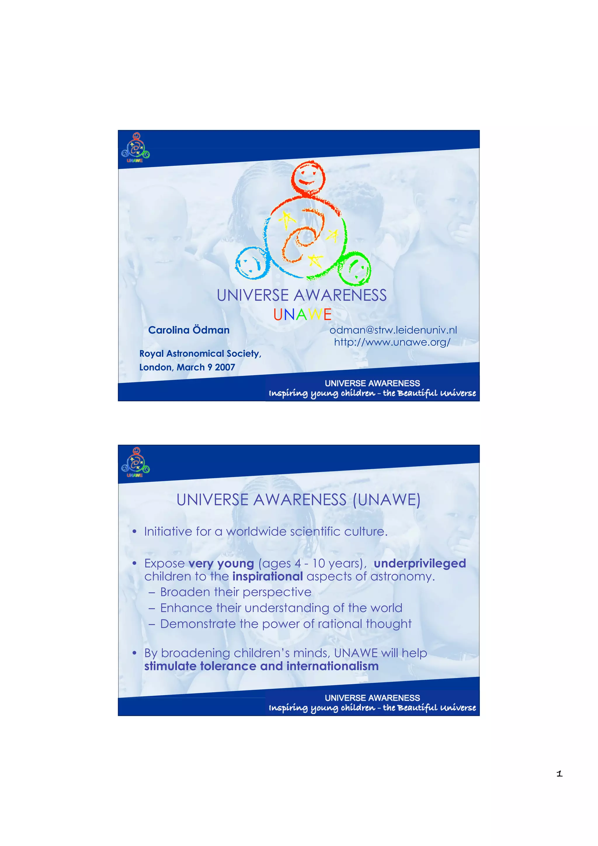 This document describes Universe Awareness (UNAWE), an initiative to expose underprivileged children ages 4-10 to astronomy. UNAWE aims to broaden children's perspectives and stimulate tolerance using inspirational astronomy lessons. It has run pilot programs in Venezuela and Tunisia and involves educators from over 20 countries developing culturally-relevant astronomy materials. UNAWE seeks to reach large numbers of children and support the UN's education goals through a bottom-up approach driven by local needs.