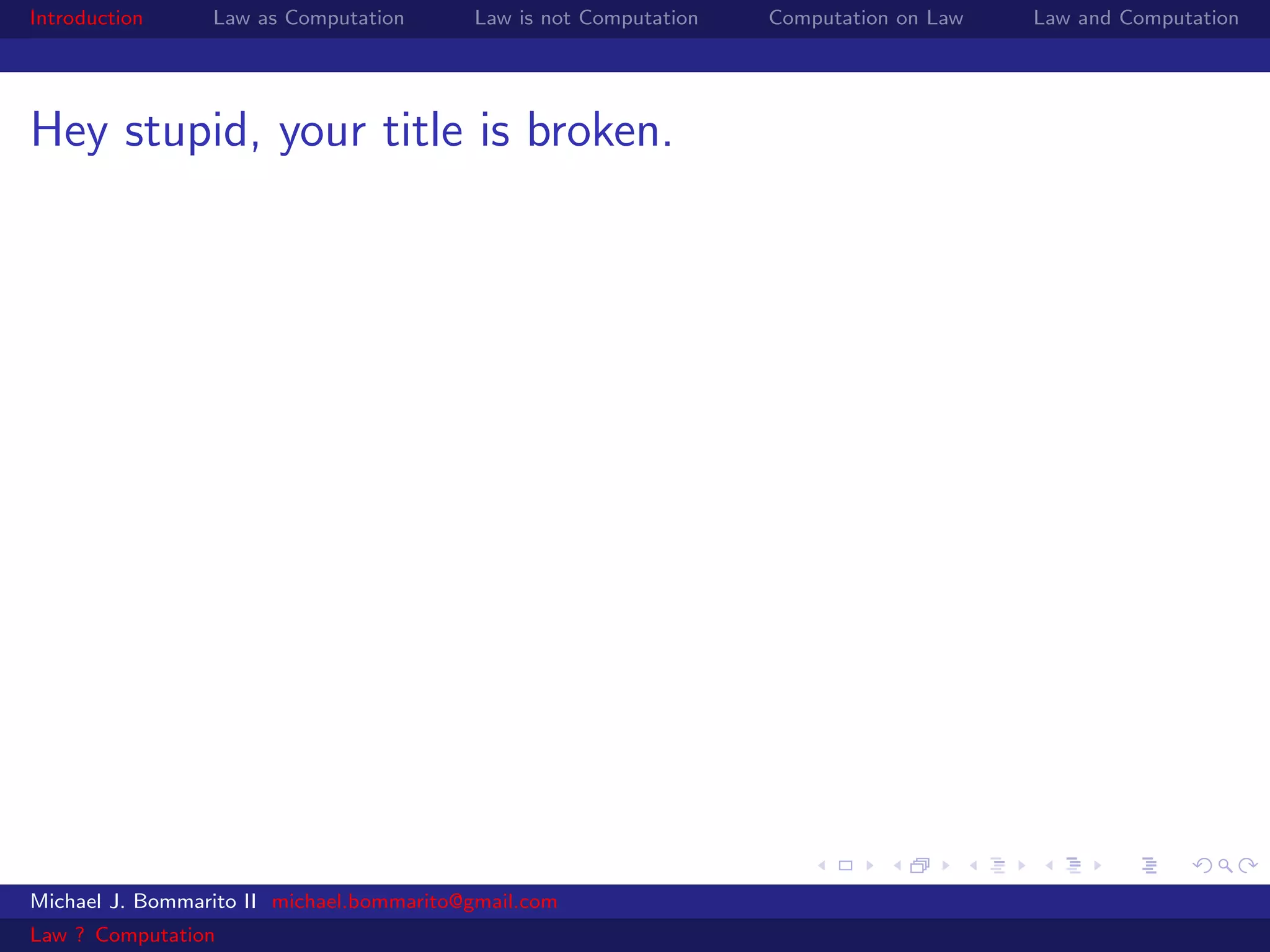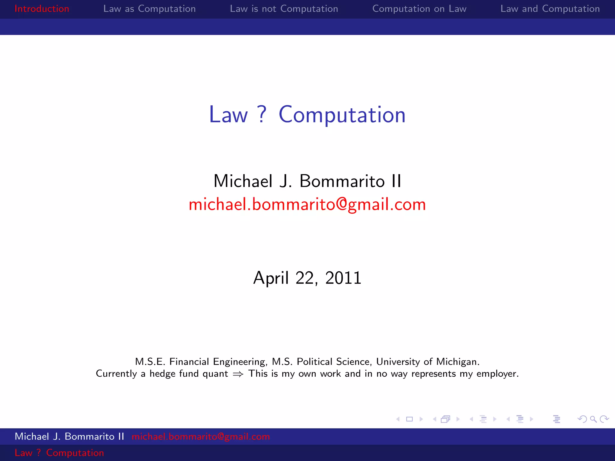 The document explores the relationship between law and computation, discussing how laws can be viewed in computational terms and vice versa. It offers definitions for both law and computation, articulating that law consists of rules affecting group interactions while computation involves systematic symbol manipulation. The author, Michael J. Bommarito II, acknowledges his non-legal background while examining interdisciplinary insights relevant to this ongoing dialogue in fields like artificial intelligence and philosophy.