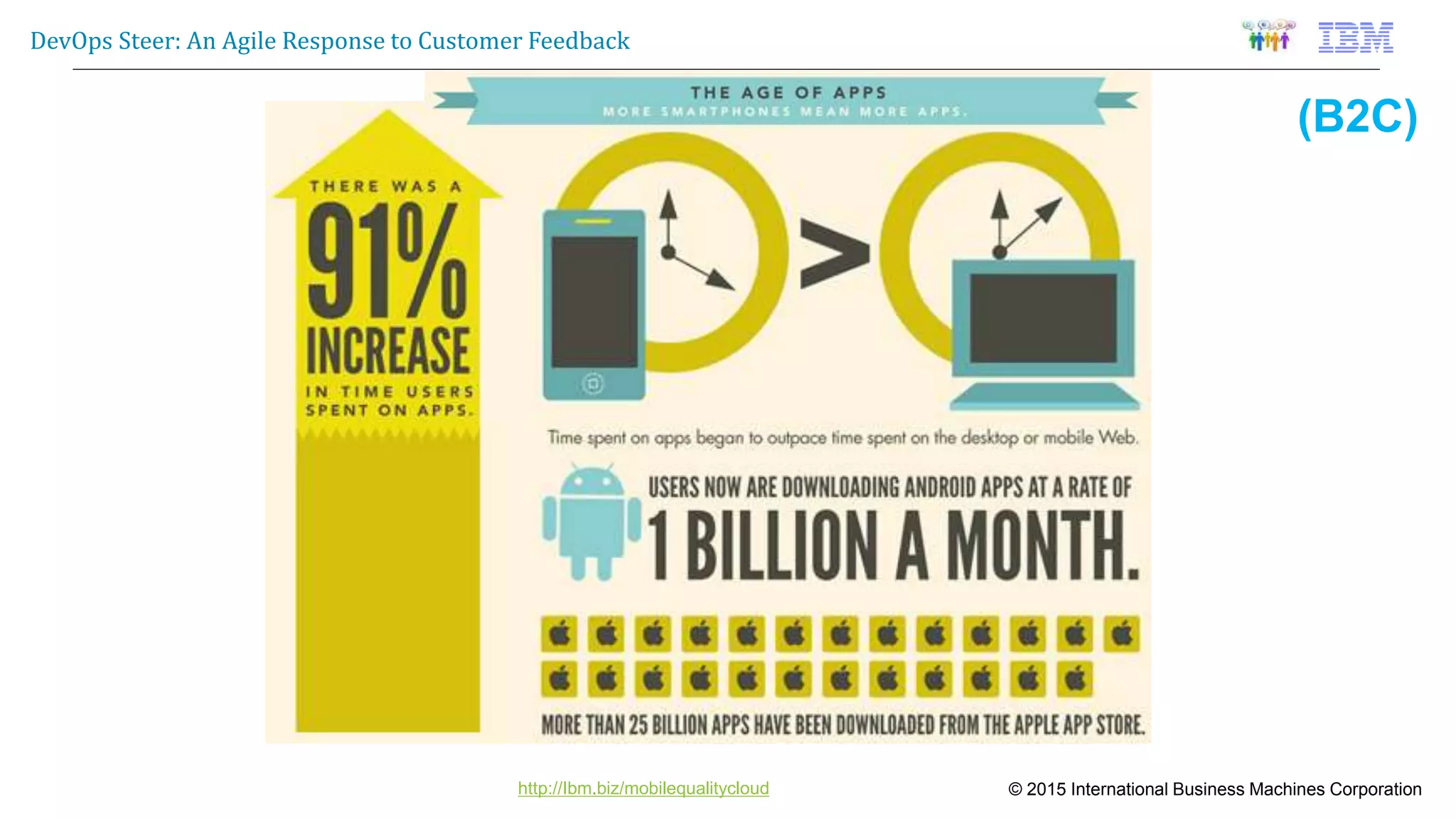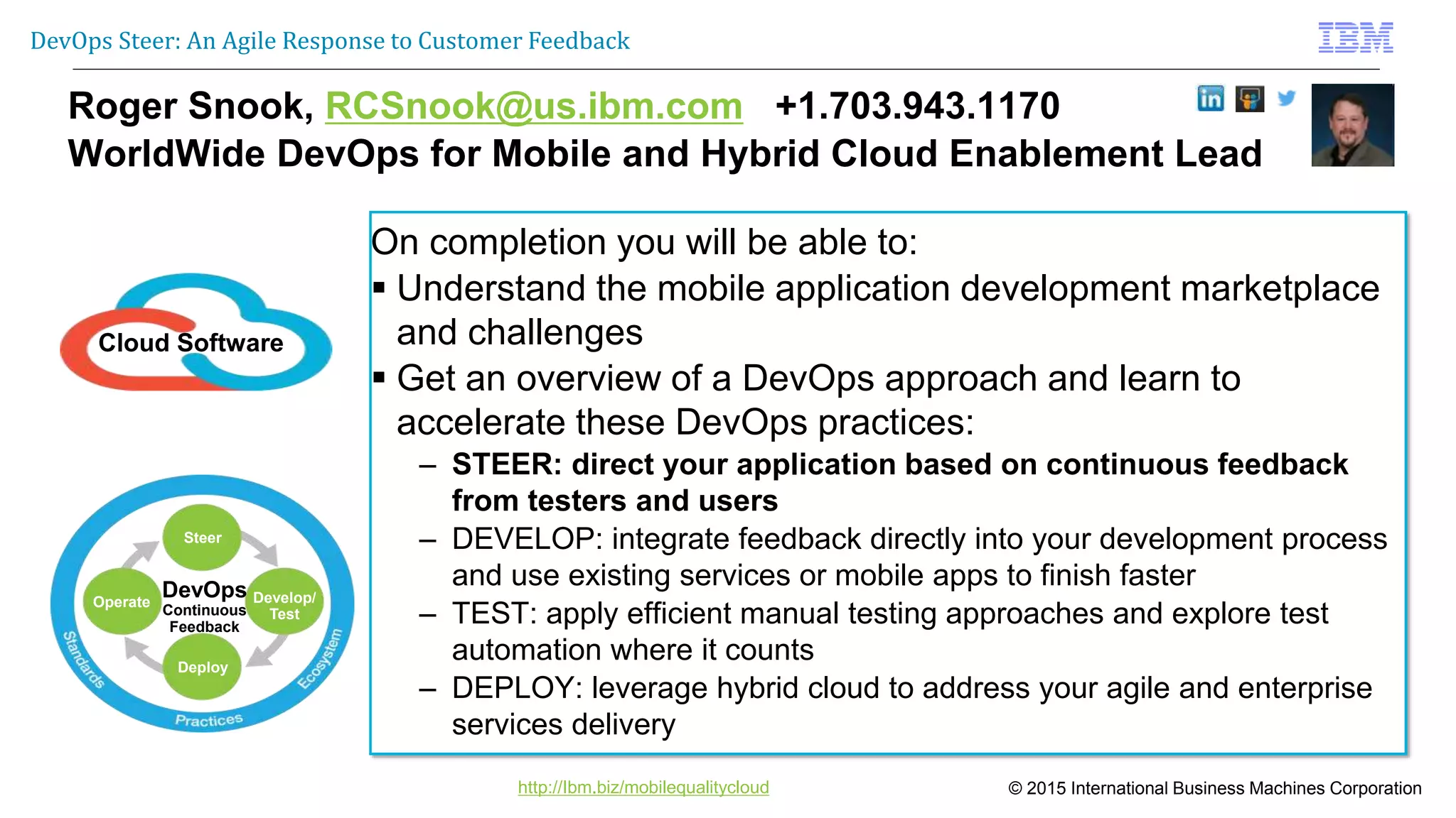 The document outlines IBM's DevOps approach to mobile application development, emphasizing the need for continuous feedback and agile practices to address market challenges. It presents a framework that includes integrating user feedback, efficient testing, and leveraging cloud technologies for faster app delivery. Furthermore, it highlights the importance of balancing speed, quality, and cost in developing mobile applications while utilizing IBM's tools and platforms for improved operations.