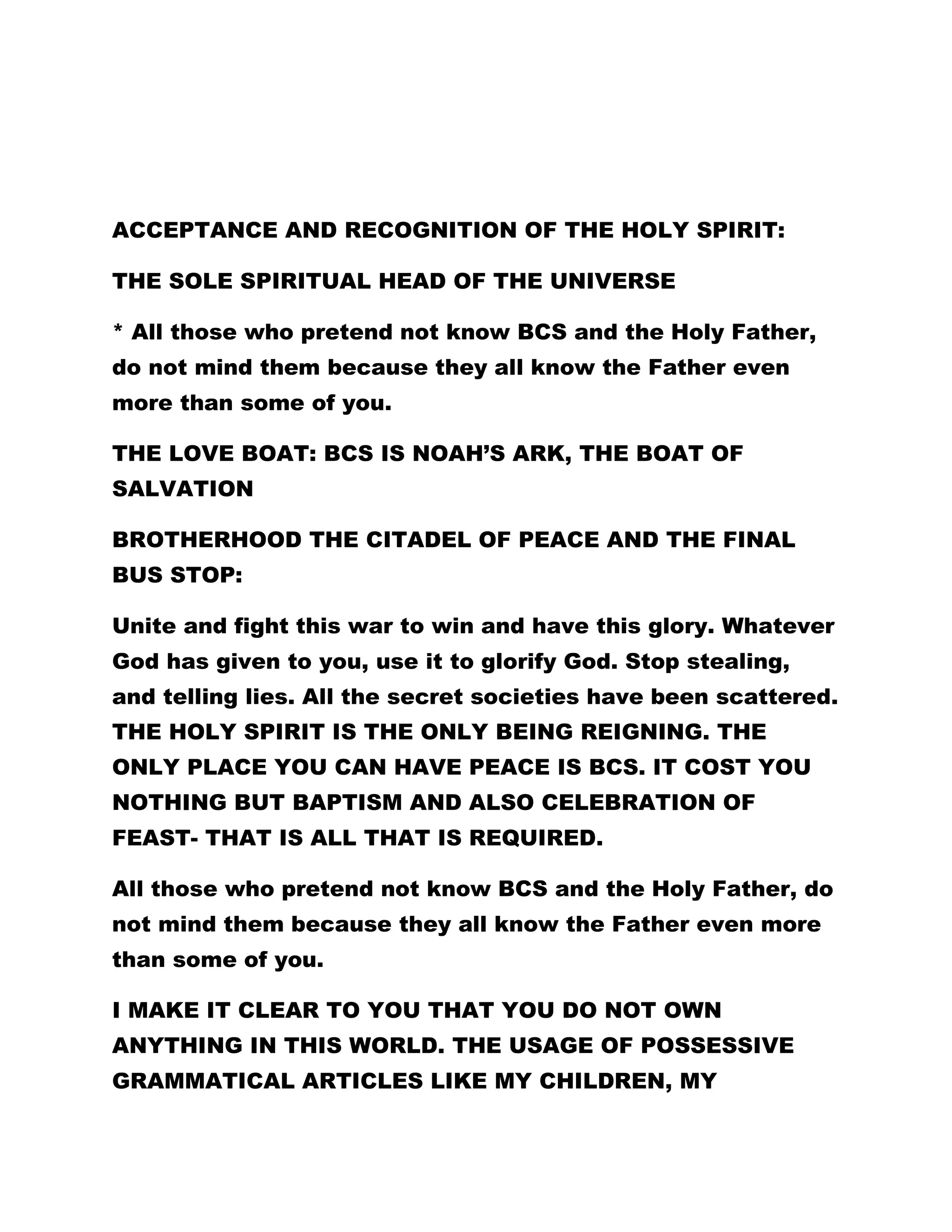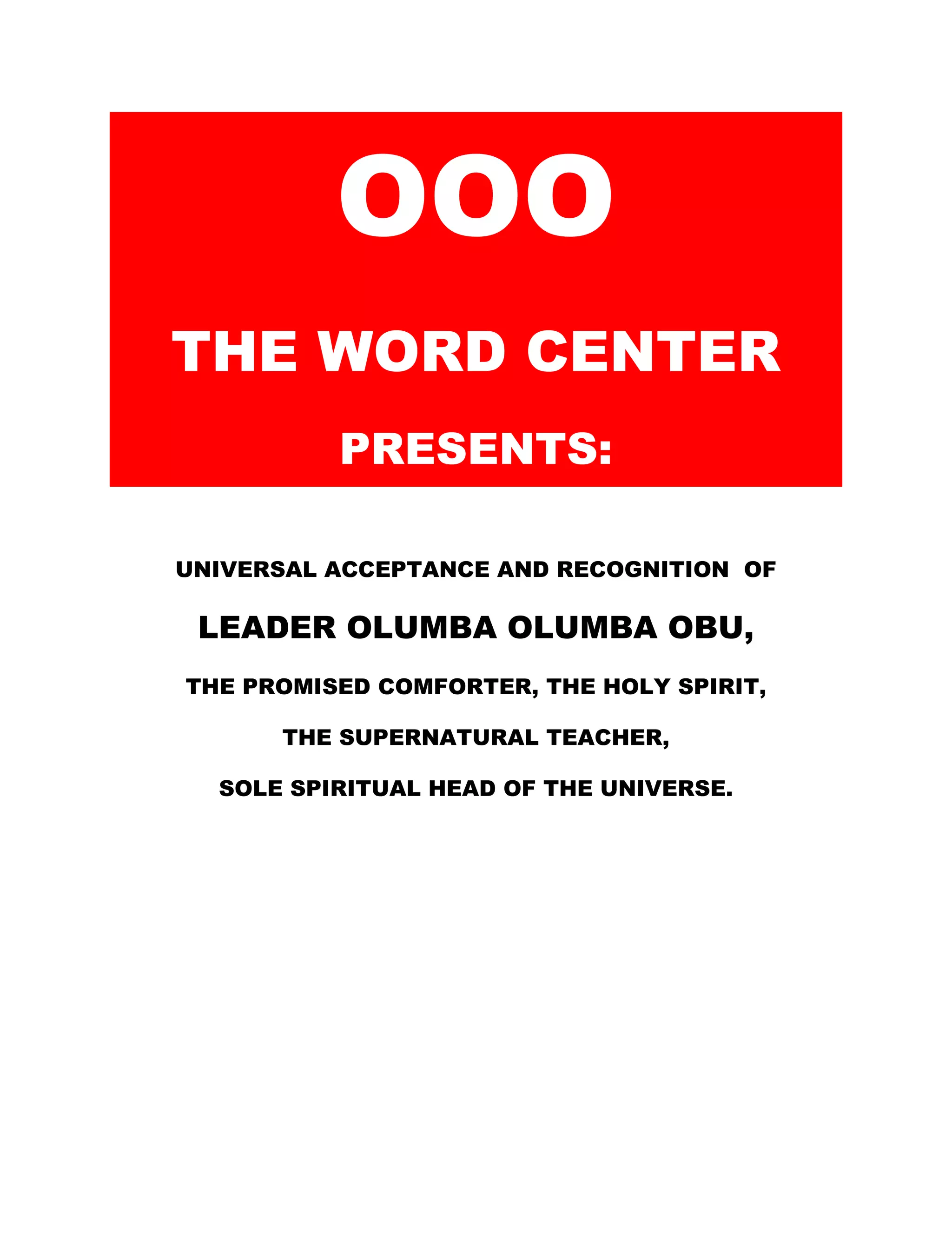 The document emphasizes the universal acceptance of Leader Olumba Olumba Obu as the Holy Spirit and sole spiritual head of the universe, advocating for love, unity, and a shift away from earthly possessions to a focus on divine ownership. It stresses the importance of spiritual enlightenment, the power of the Holy Spirit in providing true salvation, and the liberation of marginalized groups, including African Americans and women. Furthermore, it asserts that true worship and acknowledgment of God's presence lead to eternal life and alleviation from worldly troubles.