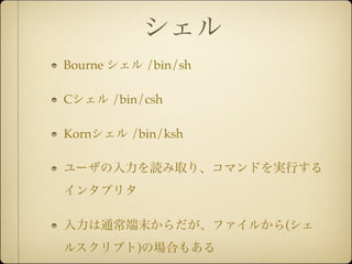 /bin/csh Kornシェル /bin/ksh ユーザの入力を読み取り、コマンドを実行する インタプリタ 入力は通常端末からだが、ファイルから(シェ ルスクリプト)の場合もある