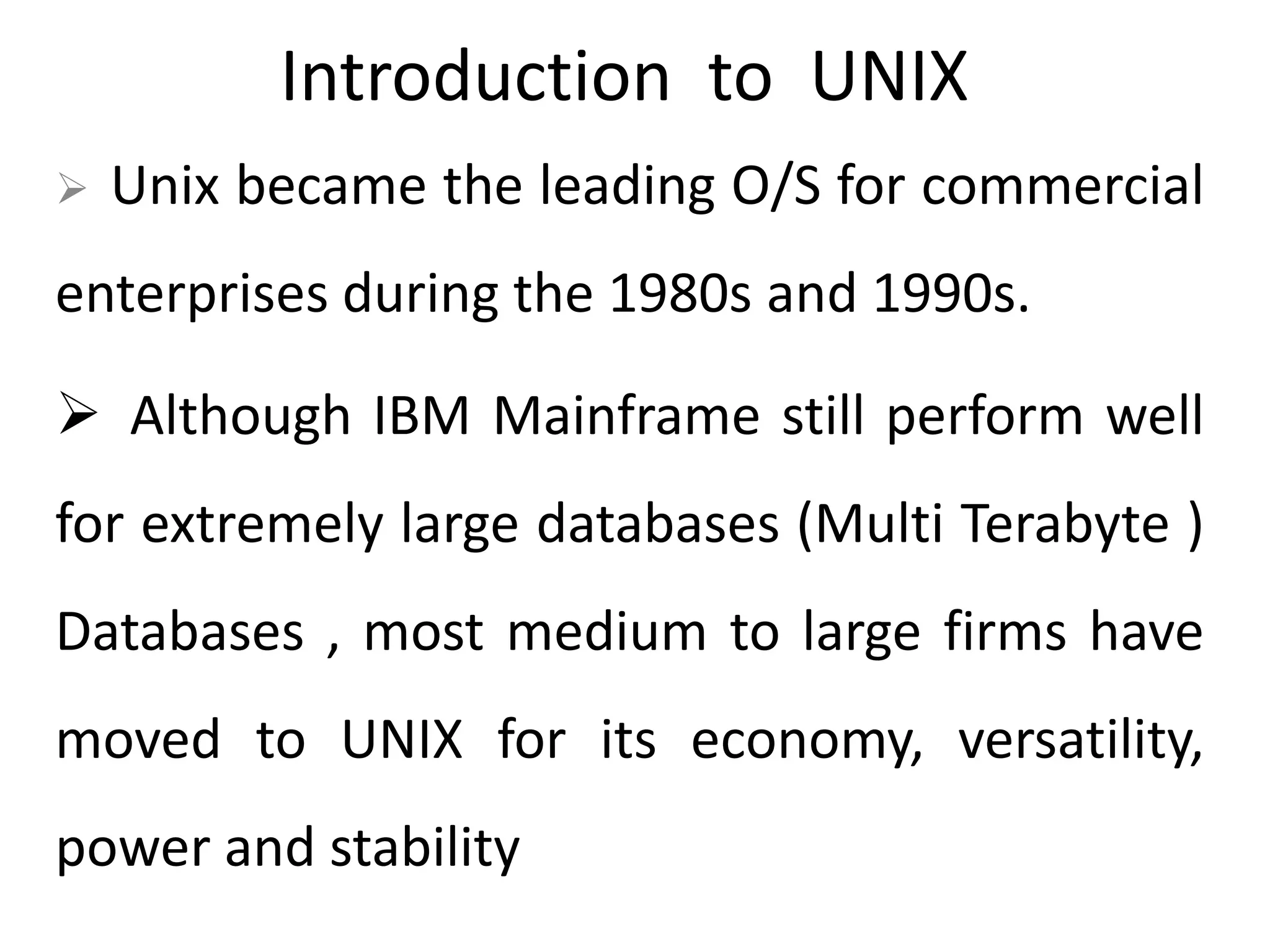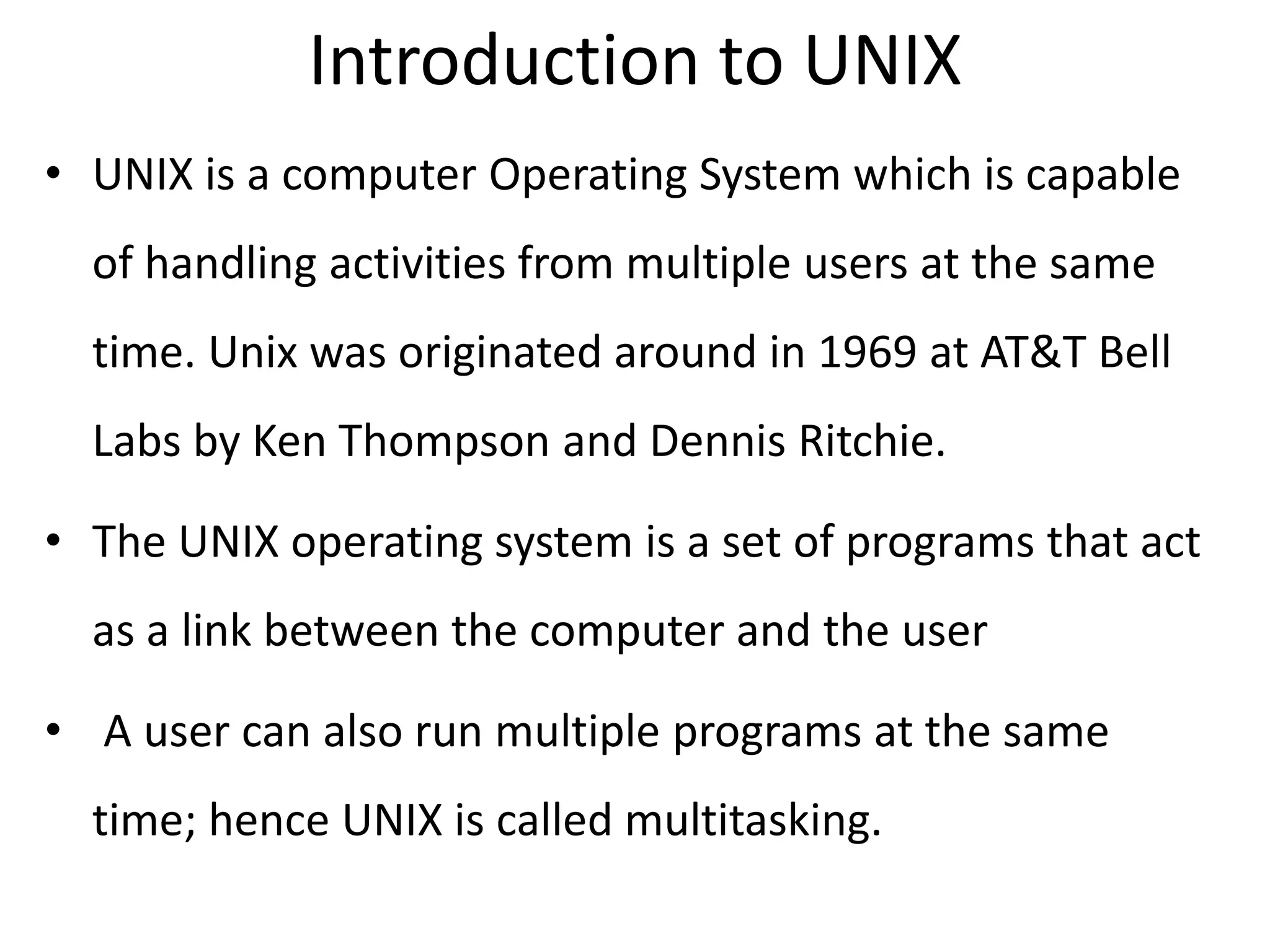Unix is a multi-user computer operating system capable of handling activities from multiple users simultaneously. It was originally developed in 1969 at Bell Labs by Ken Thompson and Dennis Ritchie. The Unix operating system acts as an interface between the user and computer, allowing users to run multiple programs simultaneously. It became a leading operating system for commercial enterprises during the 1980s and 1990s.