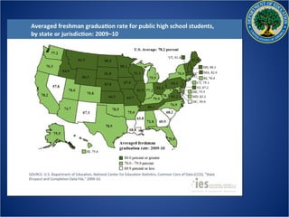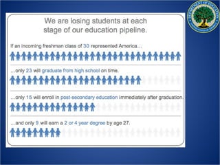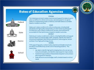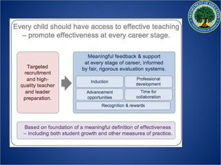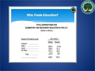 The US Department of Education aims to promote student achievement and preparation for global competitiveness. It focuses on fostering educational excellence and equal access. The department's priorities include ensuring students are college and career ready, supporting great teachers and leaders, meeting diverse student needs, providing a complete education, and fostering innovation. The RESPECT project seeks to elevate teaching as a respected profession through recognizing educational success, promoting professional excellence, and encouraging collaborative teaching.