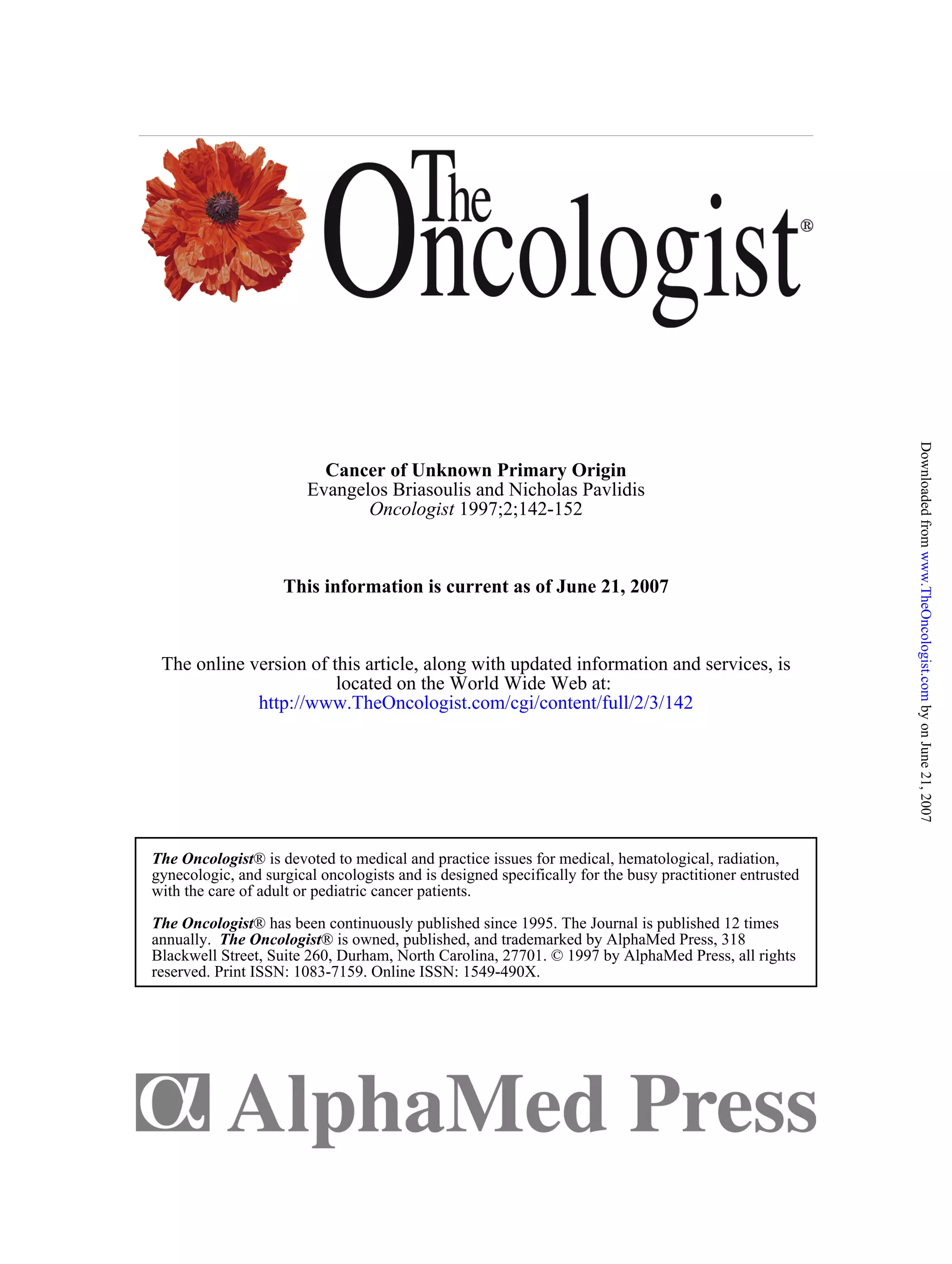 This document summarizes an article on cancer of unknown primary origin (CUP). CUP represents about 3% of cancer cases where patients present with metastatic disease but the primary site cannot be identified. Histologically, CUP is usually adenocarcinoma but can also be poorly differentiated carcinoma, squamous cell carcinoma, or other subtypes. Prognosis is generally poor with a median survival of 5-10 months, though some subgroups like women with axillary node involvement only have better outcomes. The document discusses diagnostic approaches and treatment considerations for CUP.