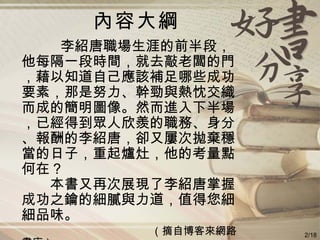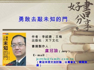 《勇敢去敲未知的門》分享了李紹唐如何通过主动寻求反馈,发展自我价值,拥抱变化与挑战,以成功应对职场波动。书中强调效忠于自己的专业,而非企业或老板,鼓励读者建立个人品牌,积极面对职业发展。保持正面思考与人际关系的维护是实现职场成功的关键。