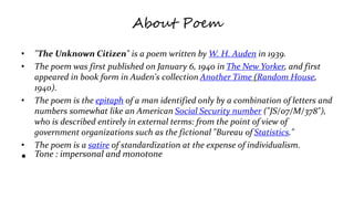 The poem summarizes the life of an "Unknown Citizen" through impersonal reports from various government organizations. It describes the man's perfect conformity to society - he was a model employee, bought newspapers daily, had a family of the recommended size, and agreed with whatever political views were expected of him. The last lines dismiss the question of whether he was truly free or happy, as the government claims it would have known if anything was wrong. Through this dystopian portrayal, the poem criticizes how the modern state reduces citizens to statistics and prioritizes conformity over individualism.