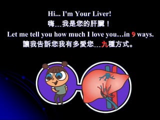 The document provides information about how much the liver loves and cares for the body in 9 ways: 1) storing iron and nutrients, 2) making bile, 3) detoxifying poisons, 4) storing energy, 5) making blood, 6) manufacturing proteins, 7) removing toxins from air, 8) making clotting factors, and 9) defending against germs. It then encourages the reader to love their liver by not overconsuming alcohol, drugs, fatty foods, or chemicals and to see a doctor if problems arise. The liver is described as a "silent partner" that works hard to keep the body healthy.