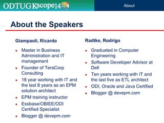 The document discusses the implementation of Hyperion Planning security within Dell's environment, focusing on the complexities of managing access to over 22,000 cost centers globally. It outlines the roles of key speakers and the methodologies for building a robust security framework using Oracle Data Integrator (ODI) to dynamically control user access based on geographical attributes. The use of various repository tables for managing users, groups, and access control is highlighted, along with two main solutions for importing security permissions into the system.