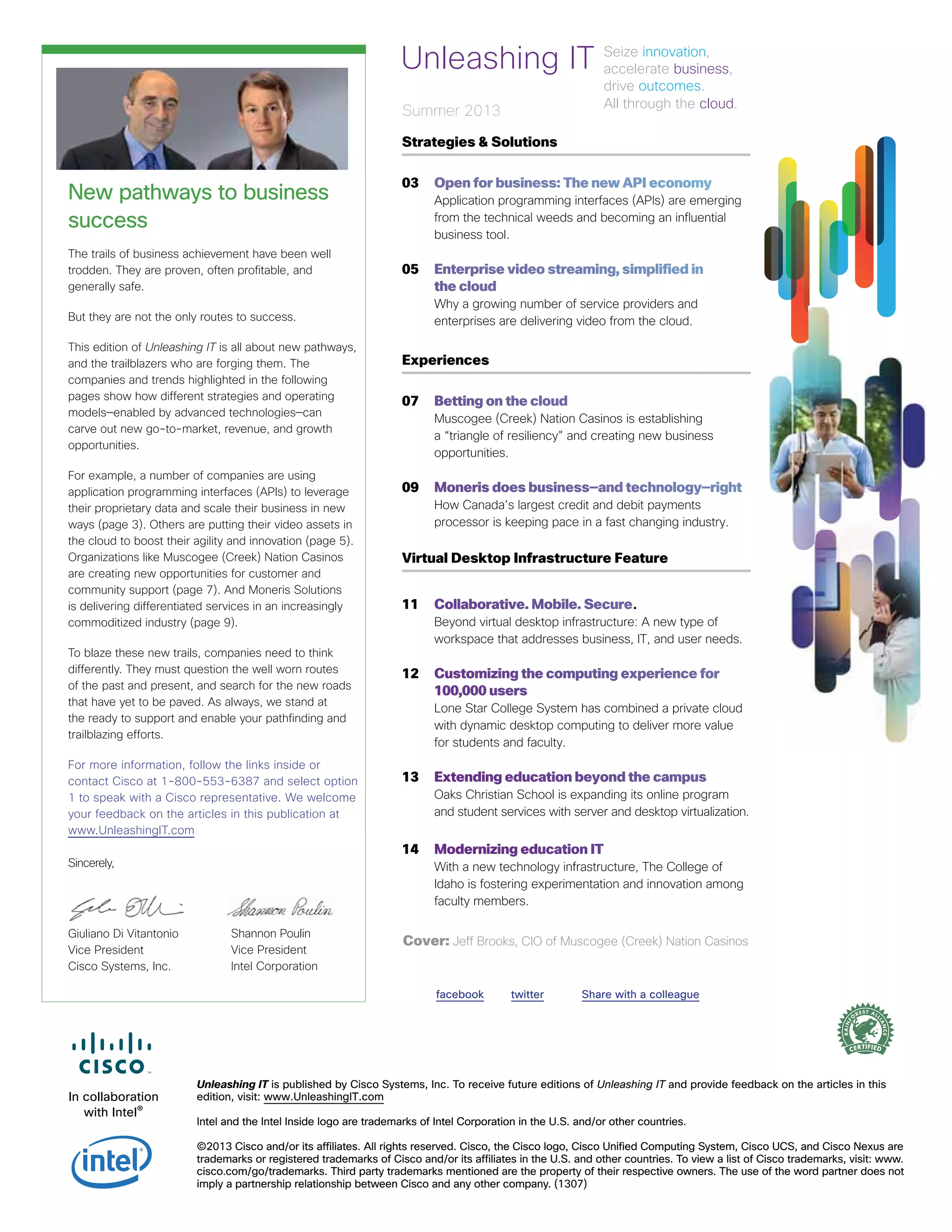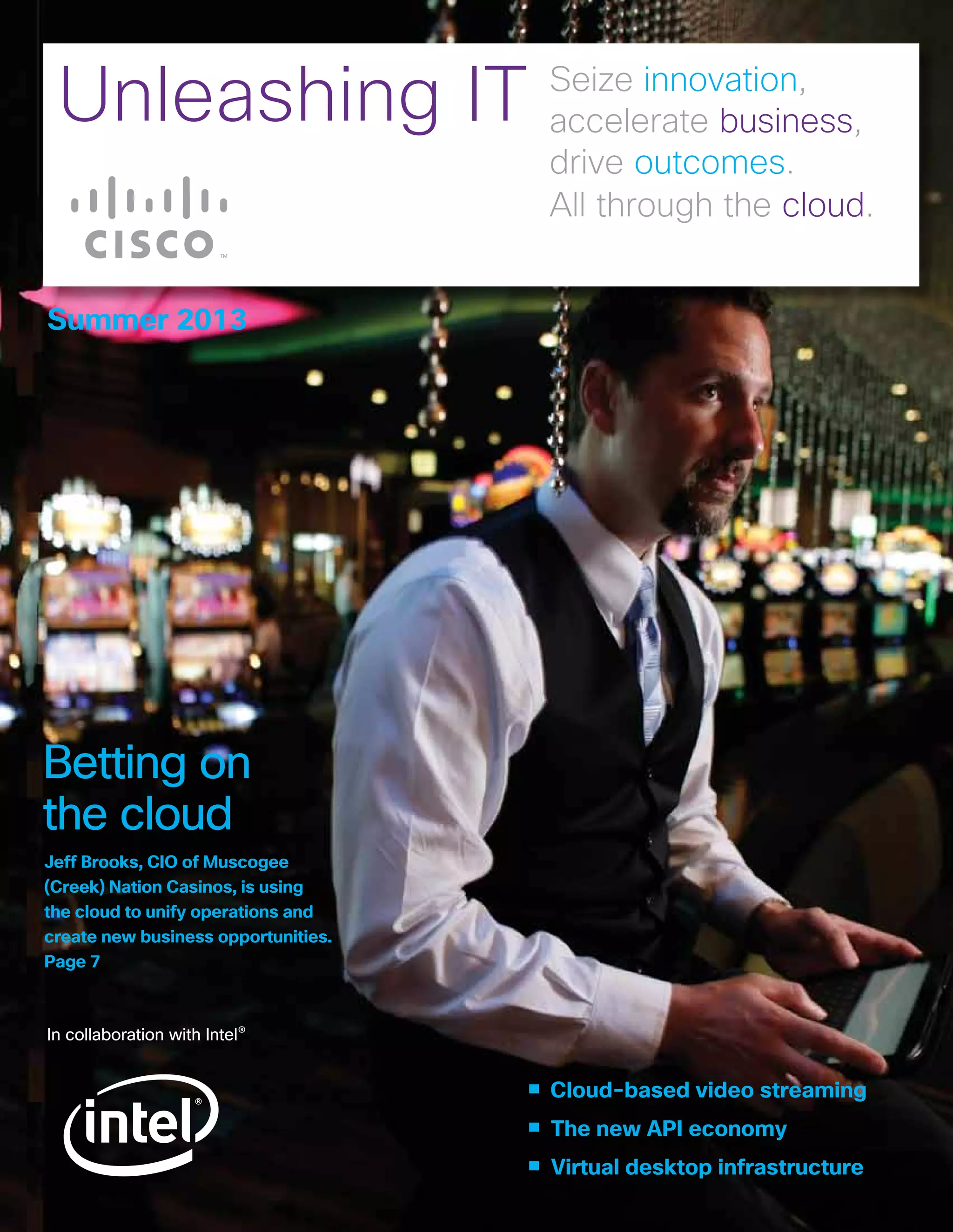 The document discusses the transformative potential of cloud technology and APIs in various business sectors, highlighting how companies like Muscogee (Creek) Nation Casinos leverage these advancements to enhance operations and customer engagement. It also emphasizes the shift to cloud-based video streaming and the need for enterprises to adapt to changing audience demands while managing complexities. The publication encourages businesses to explore innovative strategies to maintain a competitive edge in a rapidly evolving technological landscape.
