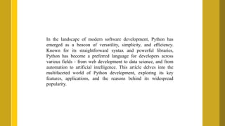 Python has become a leading language in modern software development due to its versatility, simplicity, and extensive libraries, making it ideal for various applications including web development, data science, and artificial intelligence. Its easy-to-read syntax and support for multiple programming paradigms attract both beginners and seasoned developers. The vibrant community surrounding Python fosters a rich ecosystem, positioning it for continued growth in emerging technologies.