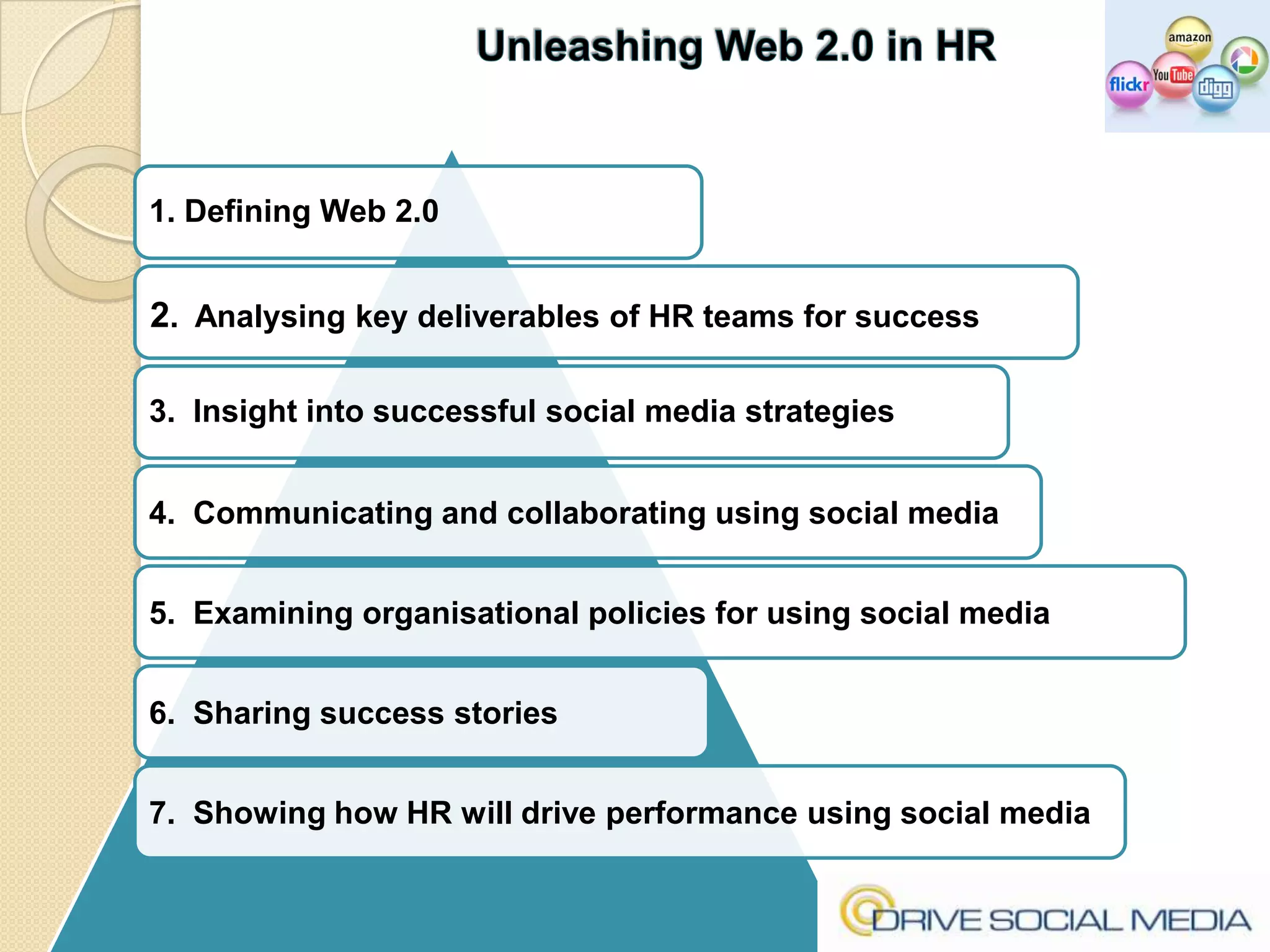 The document discusses how HR teams can leverage social media strategies. It defines Web 2.0 and analyzes key deliverables for HR success. The document provides insight into successful social media strategies for platforms like Twitter, Facebook, LinkedIn and YouTube. It outlines best practices for developing a social media strategy including establishing a presence, expanding reach, nurturing relationships and maintaining engagement. The document also examines organizational policies for social media use and shares examples of how social media has driven performance for businesses.