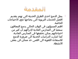 يتناول الوثيقة أهمية دمج ذوي الاحتياجات الخاصة في التعليم النظامي من خلال تقديم خدمات تربوية ملائمة وتحقيق تكامل اجتماعي وتعليمي. توضح الدراسة ضرورة تطوير استراتيجيات فعالة للتفاعل بين الطلاب العاديين وذوي الإعاقة، مع التركيز على ضرورة الوعي المجتمعي والتعاون بين المعلمين والأسر. كما تسلط الوثيقة الضوء على أهمية تهيئة المناهج الدراسية والبيئة المدرسية لتلبية احتياجات الطلاب جميعاً.