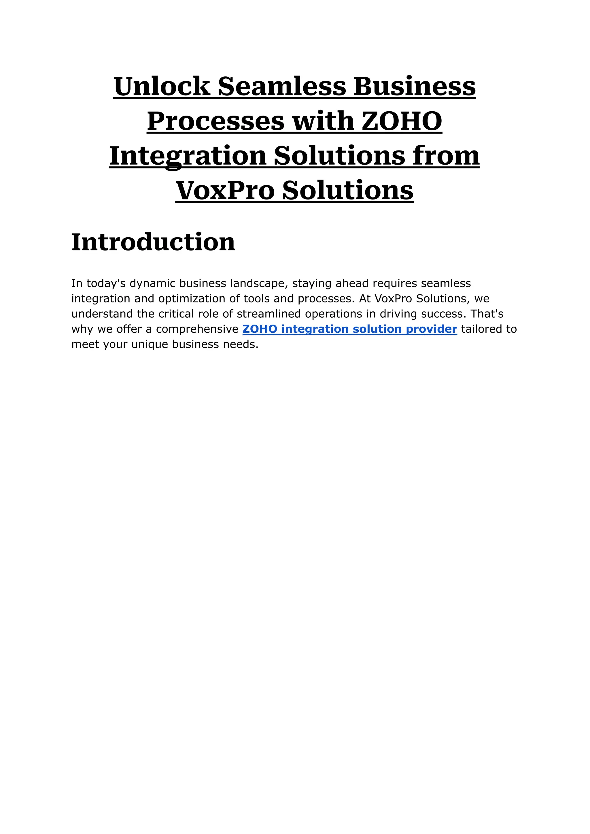 In today's fast-paced business world, efficiency and integration are paramount. At VoxPro Solutions, we specialize in providing top-notch ZOHO integration solutions tailored to optimize your business processes.