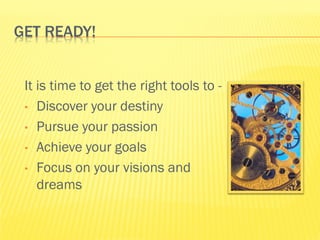 This document provides information to help individuals discover their career destiny and purpose. It discusses taking assessments to identify personality traits, values, skills, and interests in order to explore potential careers and college majors. These include Holland Codes assessments, personality inventories, and tools to identify transferable skills, motivational gifts and values. The goal is to help people match their talents and preferences to fulfilling careers.